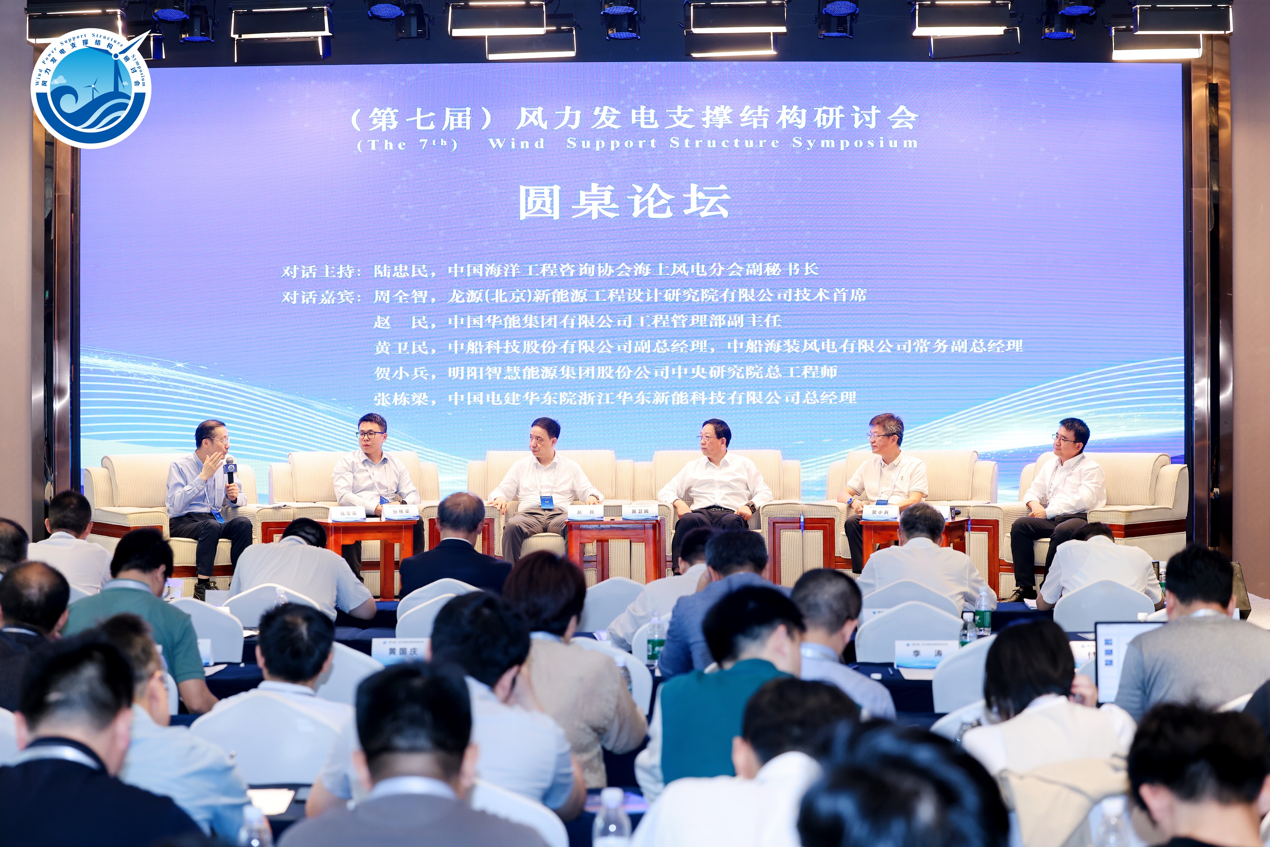 圆桌论坛由中国海洋工程咨询协会海上风电分会副秘书长陆忠民主持,中国华能集团有限公司工程管理部副主任赵民、中船科技股份有限公司副总经理,中船海装风电有限公司常务副总经理黄卫民、龙源(北京)新能源工程设计研究院有限公司技术首席周全智、中国电建华东院浙江华东新能科技有限公司总经理张栋梁、明阳智慧能源集团股份公司中央研究院总工程师贺小兵等来自能源开发、设计研发、装备制造等领域的多位行业专家围绕国家发改委“136号文”政策影响、深远海风电技术突破及产业全球化布局展开深度对话,为风电产业高质量发展建言献策。